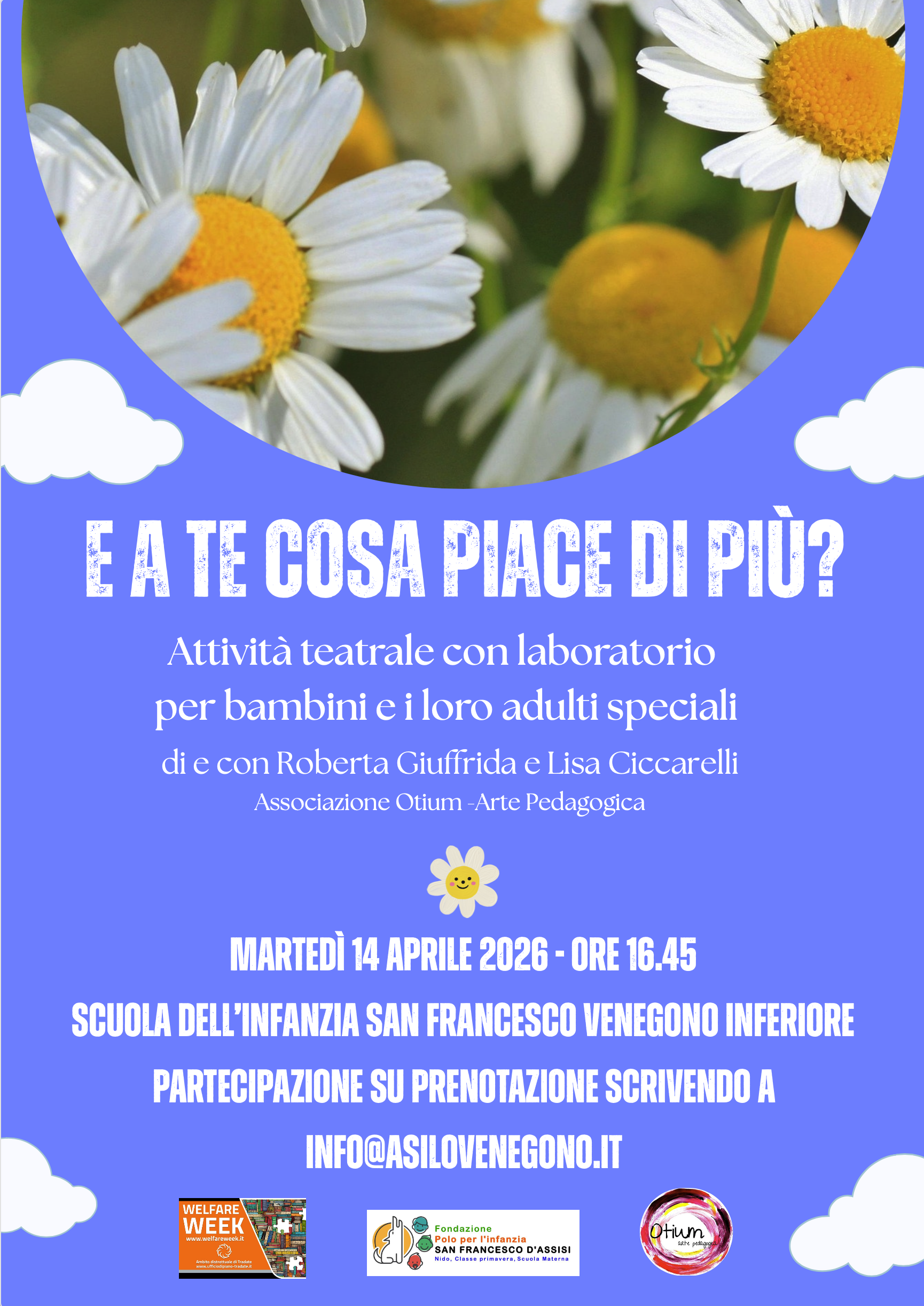 MARTEDI’ 14/04/2026 ore 16.45 E a te cosa piace di più? Attività teatrale con laboratorio A cura di: Associazione Otium arte-pedagogica Asilo San Francesco – Vengono Inferiore