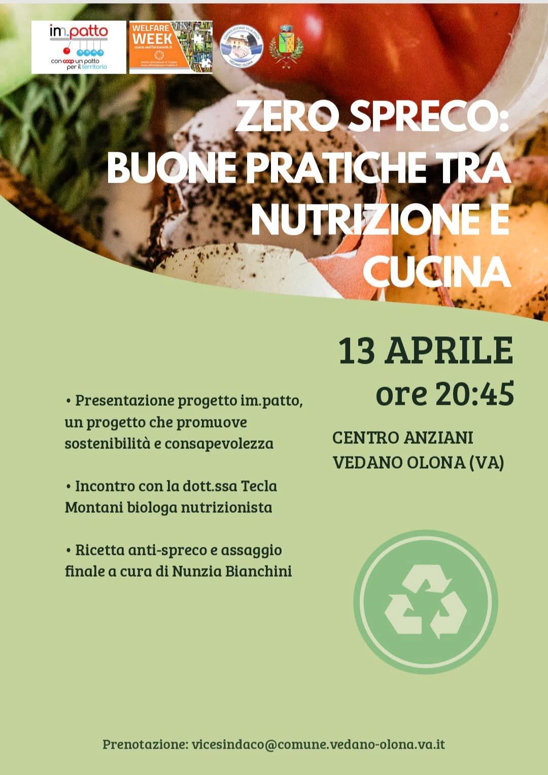 LUNEDI’ 13/04/2026 ore 20.45 Zero Spreco: buone pratiche tra nutrizione e cucina A cura di: Centro anziani Vedano Olona e Progetto Im.patto Centro Anziani – Vedano Olona